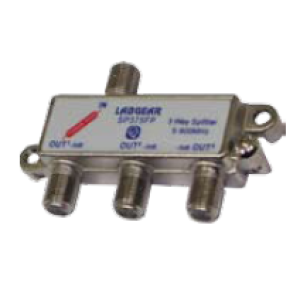 3 way “F” type splitter. Power pass one port. Insertion loss -5.5dB @ 500MHz.