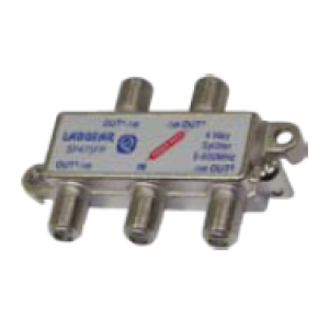 4 way “F” type splitter. Power pass one port. Insertion loss -7dB @ 500MHz.